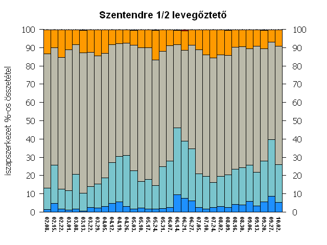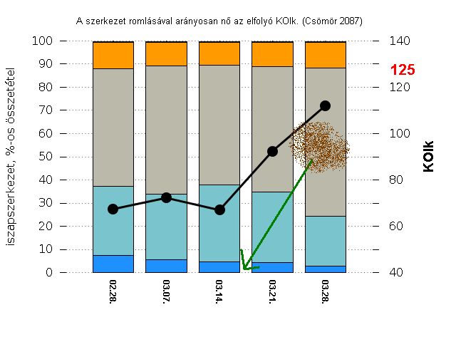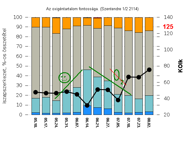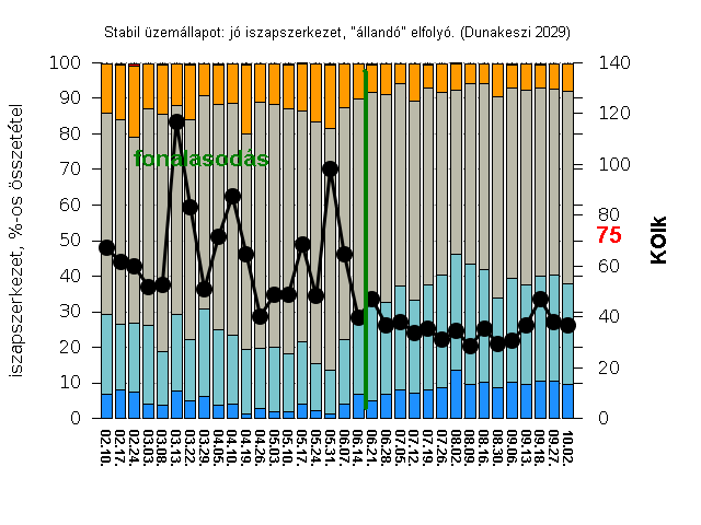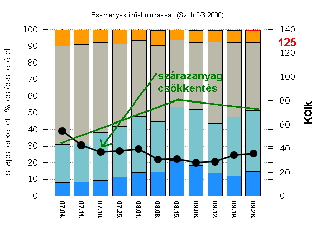 ![]() | 35 hét vizsgálata látható. Az első részt szeszélyes változások jellemzik. Év elejétől nagymértékű fonalasodás jellemző, amit többek között levegőbeviteli nehézségek okoztak. A fonalasok üzemeltetési nehézségeket okoztak, (sűrítés, rothasztás...). A második részben egy erősödő szerkezetet és ezzel párhuzamosan javuló, stabil KOIk-t láthatunk. Mindezt a változást az iszap szárazanyagának lassú, fokozatos csökkentésével értük el. |