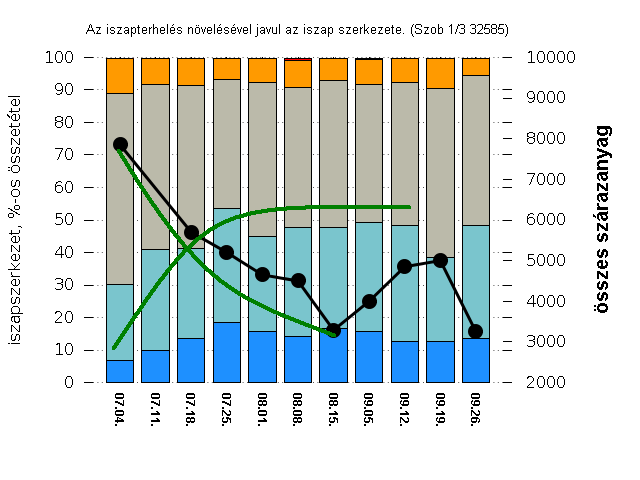 ![]() | A levegőztetett medencék iszapszerkezete és szárazanyag tartalma közti összefüggések: A túl magasan tartott szárazanyag koncentráció gazdaságtalan üzemeltetést eredményez. Az iszap elhelyezés átszervezésével letermeltük a felesleget. Szeptemberre a hab bedolgozódott (mintavétel is könnyebbé vált). A szárazanyag tartalom csökkentésével, nőtt a terhelés, a pehelyképzők előnyhöz jutottak és a fonalasság visszaszorult. A jobb szerkezetű iszap jobban is ülepszik, megkönnyítve a fölösiszappal való további teendőket. |