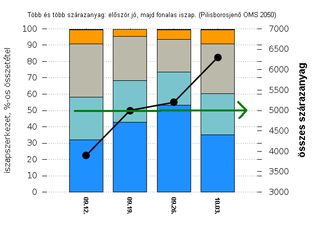 ![]() | A szárazanyag tartalom növekedésével a szerkezet kezdetben javult, majd 5 kg/m3 felett gyengült. A telepre jellemző optimális szárazanyag értéket érdemes fenntartani (évszakonként eltérhet). |