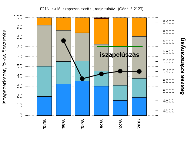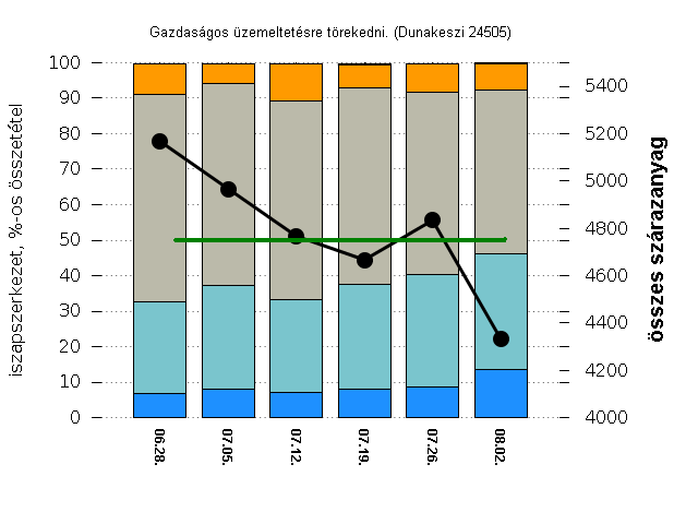 ![]() | Hosszabb időszak áttekintése. A stabilizáció után ügyelni kell az üzemeltetéshez szükséges berendezések működőképességére, illetve a tartalékok meglétére! Problémáink voltak a fúvókkal és recirkulációs szivattyúkkal. A levegőbevitel a napi és hétvégi terheléseknél nem fedezte a telep szükségletét. Augusztus elejétől maximális légbevitel és recirkuláció mellett a javuláshoz több hétre volt szükség. |