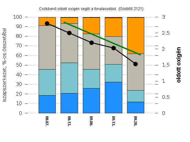 ![]() | A szárazanyag tartalom mellett a másik fontos üzemeltetési paraméter az oldott oxigén. A kevesebb oldott oxigén kedvez a fonalasok szaporodásának (nagyobb fajlagos felületük miatt hatékonyabb felvétel). Az oldott oxigént takarékossági szempontból tartjuk a legalacsonyabb elfogadható szinten. Ez évszakonként és telepenként eltérő. Az iszapszerkezet ismerete és változásainak tendenciái segítik megtalálni az optimális koncentrációt. |