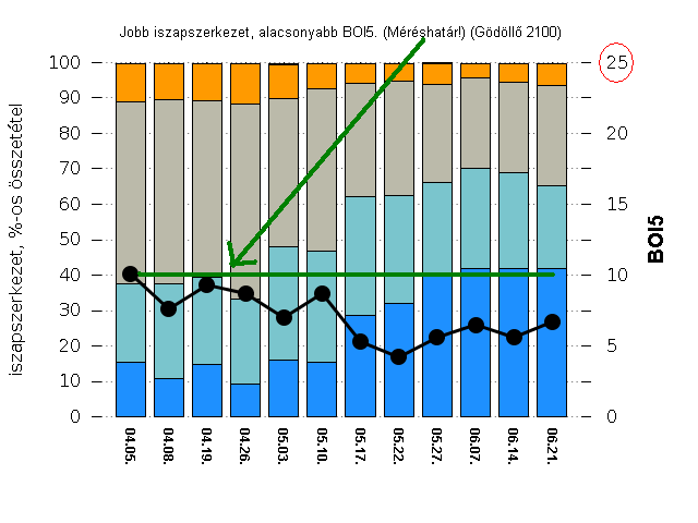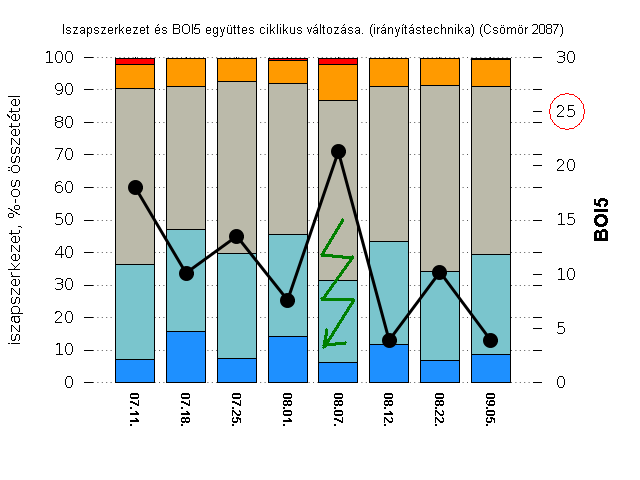![]() | A következő vizsgált paraméter a biológiai oxigén igény. A grafikonon párhuzamos változásokat figyelhetünk meg, jobb szerkezet jobb BOI5-t eredményez. Augusztus elejétől az automata vezérlés meghibásodása nehezítette a telep beállításait. Ez megmutatkozik a kiugró BOI5 értékben. Az üzemeltetéshez megfelelő műszerezettség szükséges. |