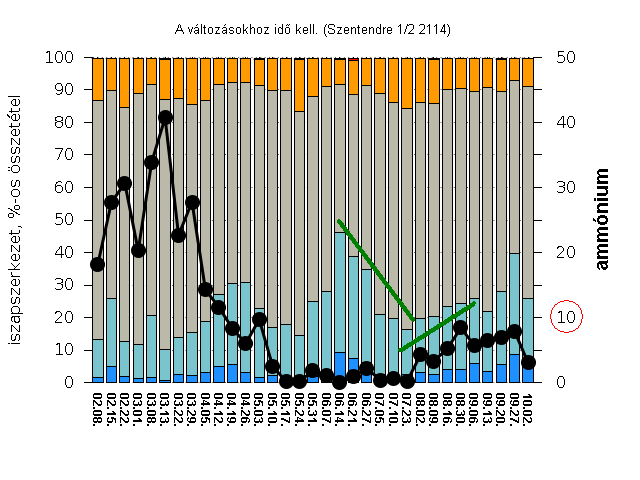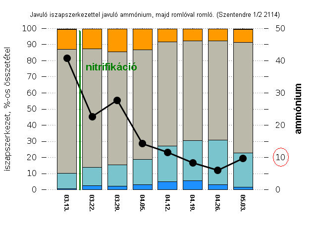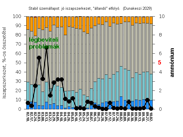 ![]() | Az ingatag és stabil üzemállapot összefüggése az iszapszerkezettel most ammóniumra nézve. Az év eleji kiugró ammónium értékek hátterében levegőproblémák álltak. A problémákra hamar fény derült, de javításuk elhúzódott, így kényszermegoldásokat alkalmaztunk. |