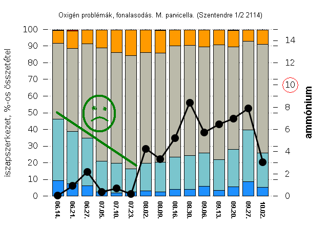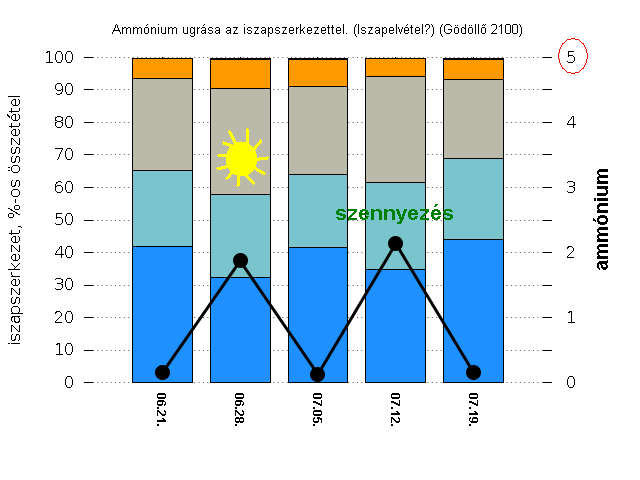 ![]() | Az iszapszerkezet és ammónium párhuzamos változásai. Az ammónium emelkedés okai: -A melegebb időben az iszap gyorsabban szaporodott, fölösiszap elvételeket sűrűbben korrigáltuk. -A telepre nagy mennyiségű nyersiszap szennyezés érkezett ami elhasználta az oxigént, szárazanyagot csökkentettük. |