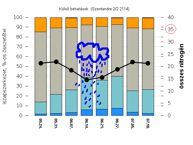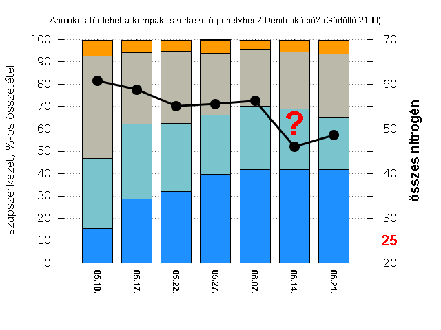 ![]() | Végül az összes nitrogén és az iszapszerkezet összefüggései: A vizsgált telepen az iszap váltakozva anoxikus és oxikus körülmények közé kerül. A pelyhek így nem tudnak megerősödni. A telepre jellemző fonalas a Microthrix parvicella szinte állandóan jelen van. A szerkezetjavulás hátterében a csapadékos idő okozta hidraulikai terhelés növekedése áll. Az iszap egy része kimosódott (főleg a rosszabb szerkezetű), ami kedvezően befolyásolta a pehelyképzők szaporodását. Azóta beépítésre került egy bukóél, ami maximálja a biológiára mehető szennyvíz mennyiségét, így megvédi az eleveniszapot a kimosódástól. A többletvíz mechanikai tisztítás után folyik a tisztított szennyvízhez. |